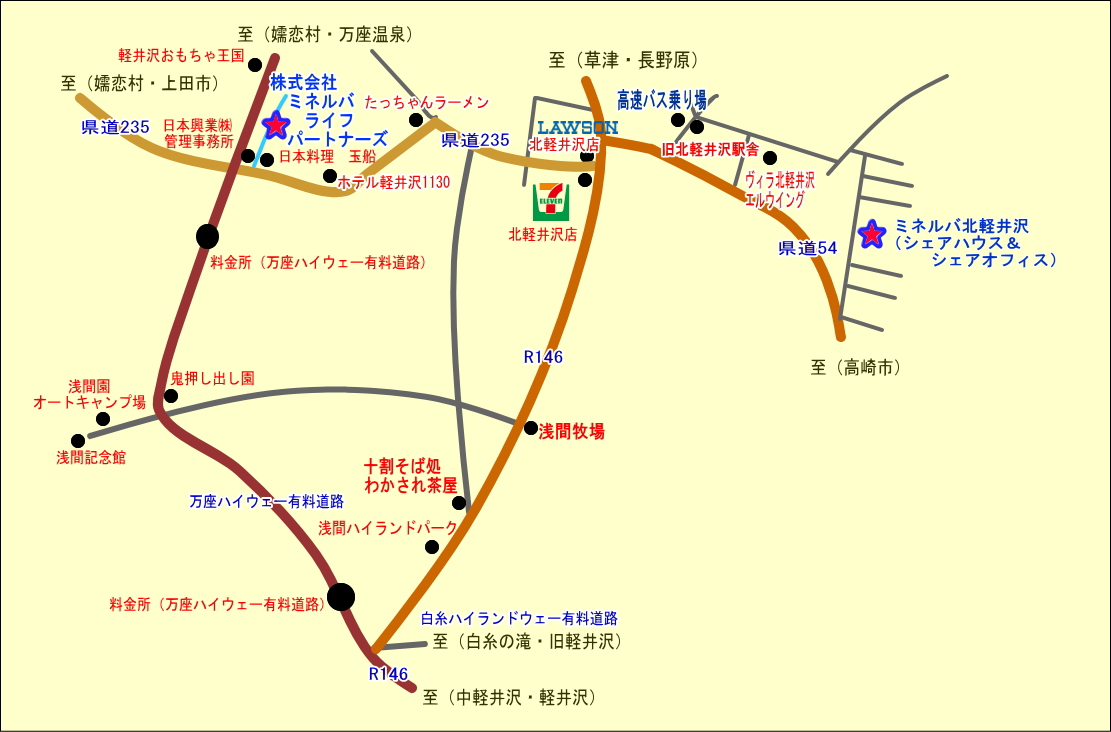 事務所前を北軽井沢方面へ50m行き、日本興業別荘地内道路方面へ左折後、300m入ったところの右側